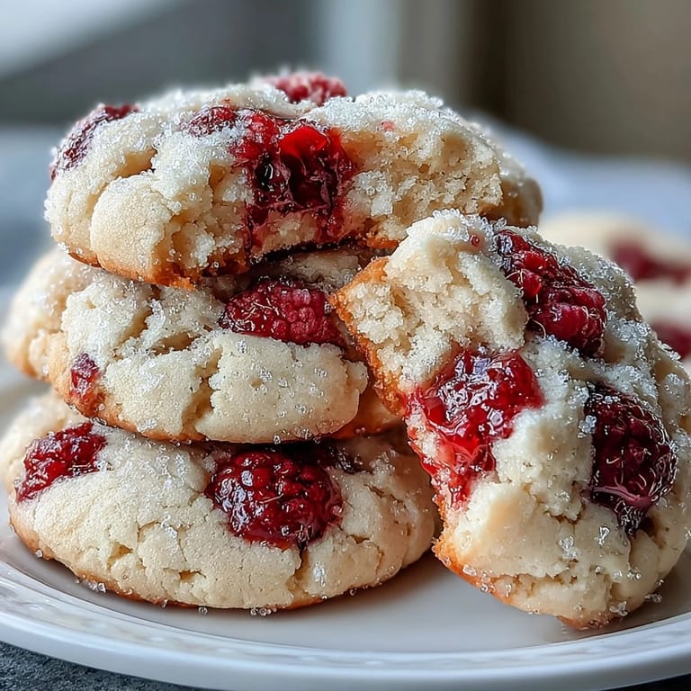 Pin it My sister showed up one Saturday morning with a pint of raspberries that were about to turn, and I panicked because I had no pie crust defrosted. We ended up tossing them into basic sugar cookie dough, and honestly, it was one of those happy accidents that became a monthly ritual. The raspberries burst and stain the dough pink in the most beautiful way, and the chewy edges contrast perfectly with the soft, jammy centers. Now every time berries go on sale, I buy extra just for these. They disappear faster than any brownie I've ever made.